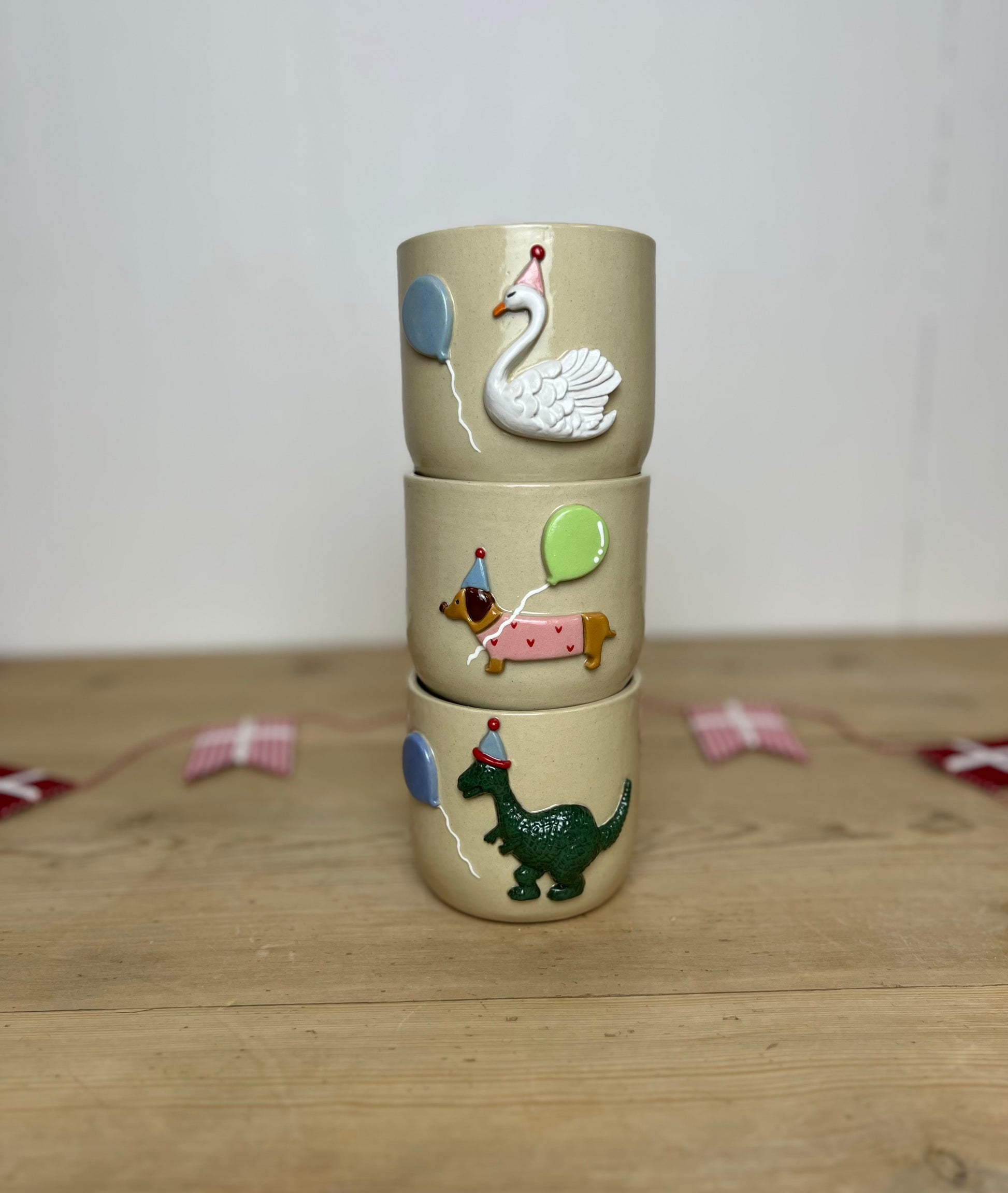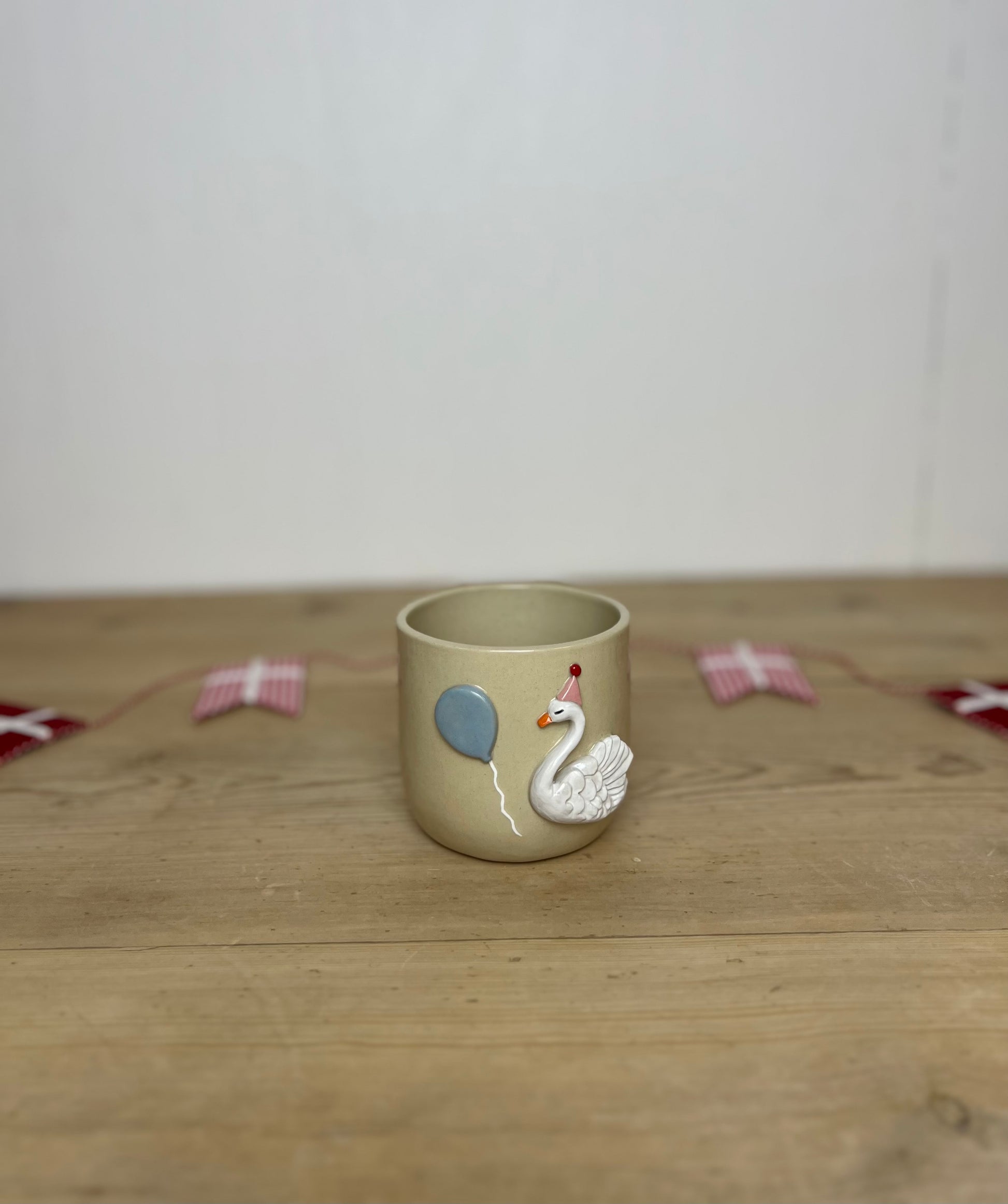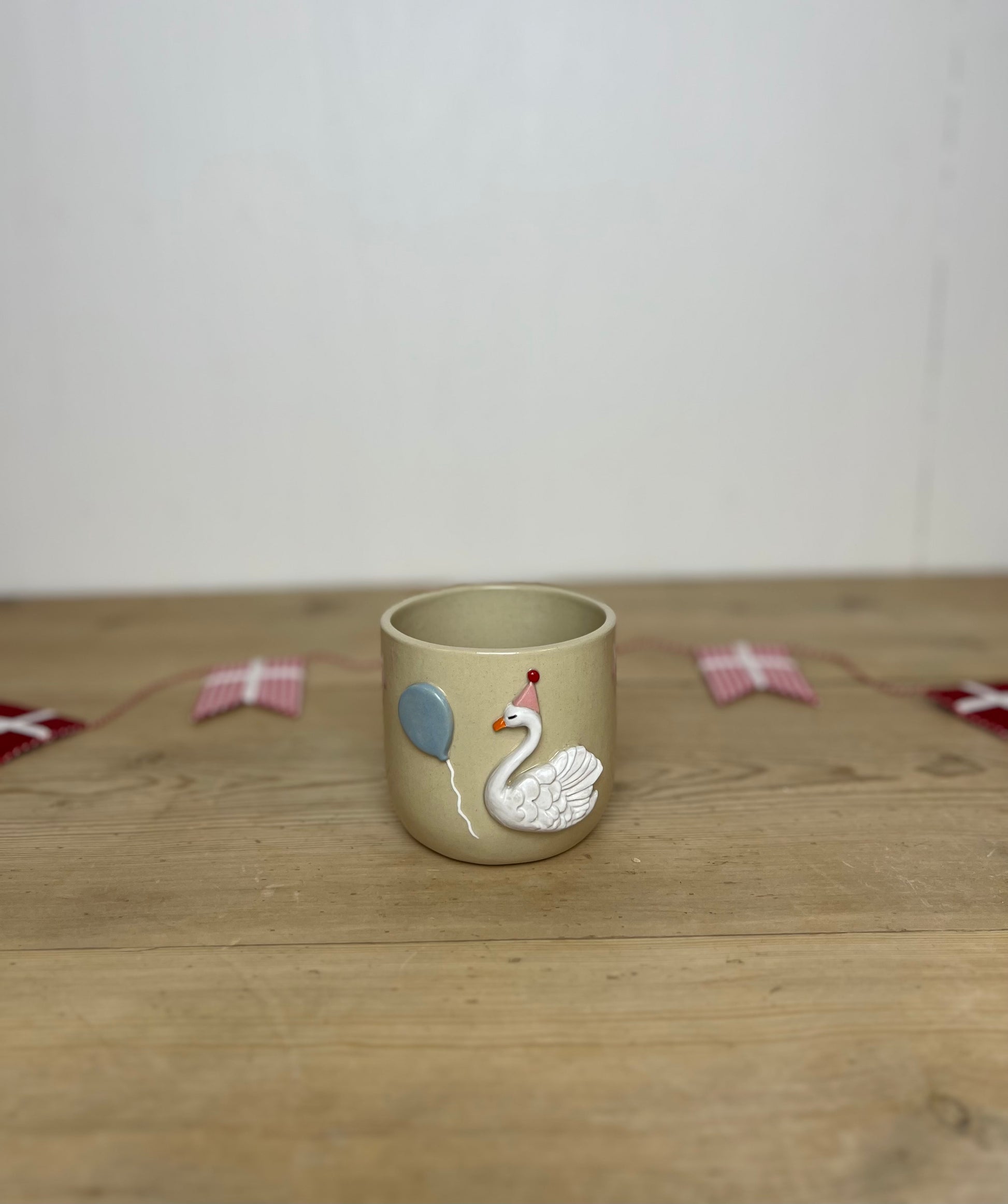 En håndlavet kop med en fødselsdagssvane, der har pyntet sig til fest 🎂🎈 Hat på og ballon i hånden – klar til at fejre dagen med stil (og lidt fjol).