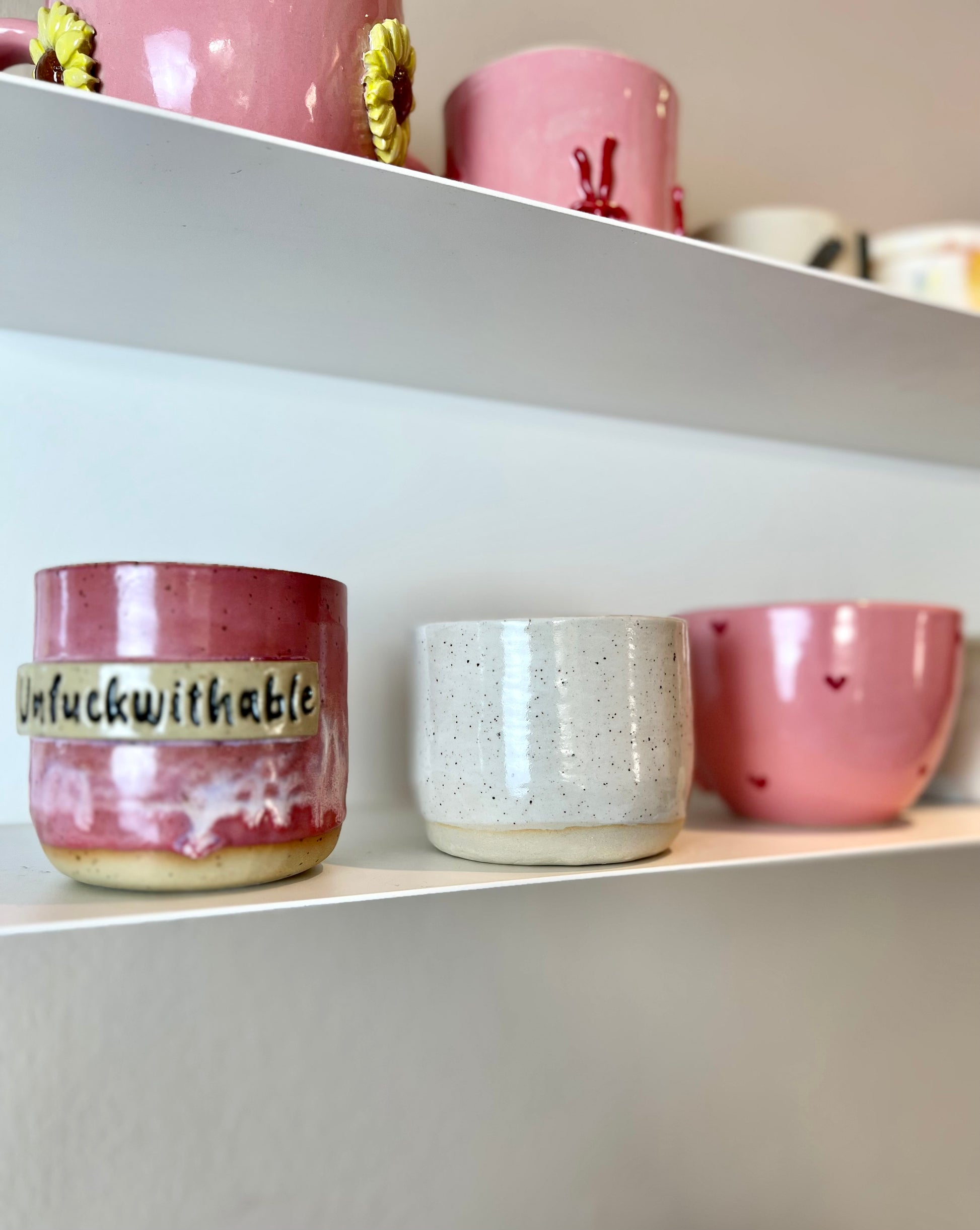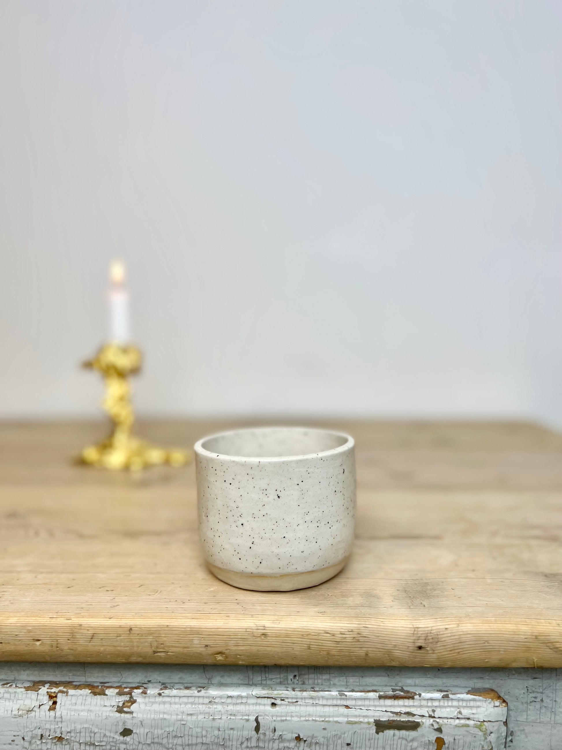 Et stort krus i en smuk cremefarve med små prikker i glasuren.