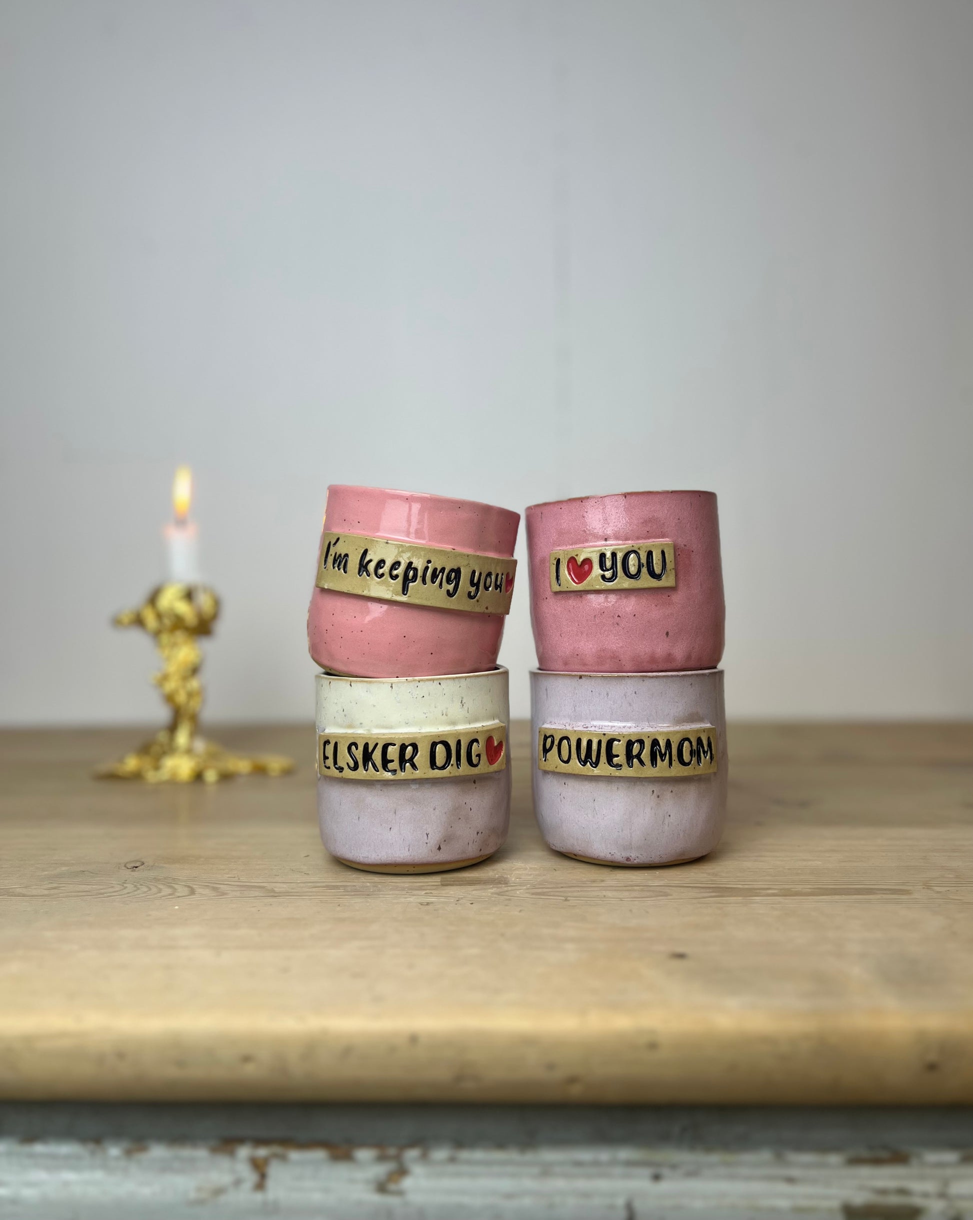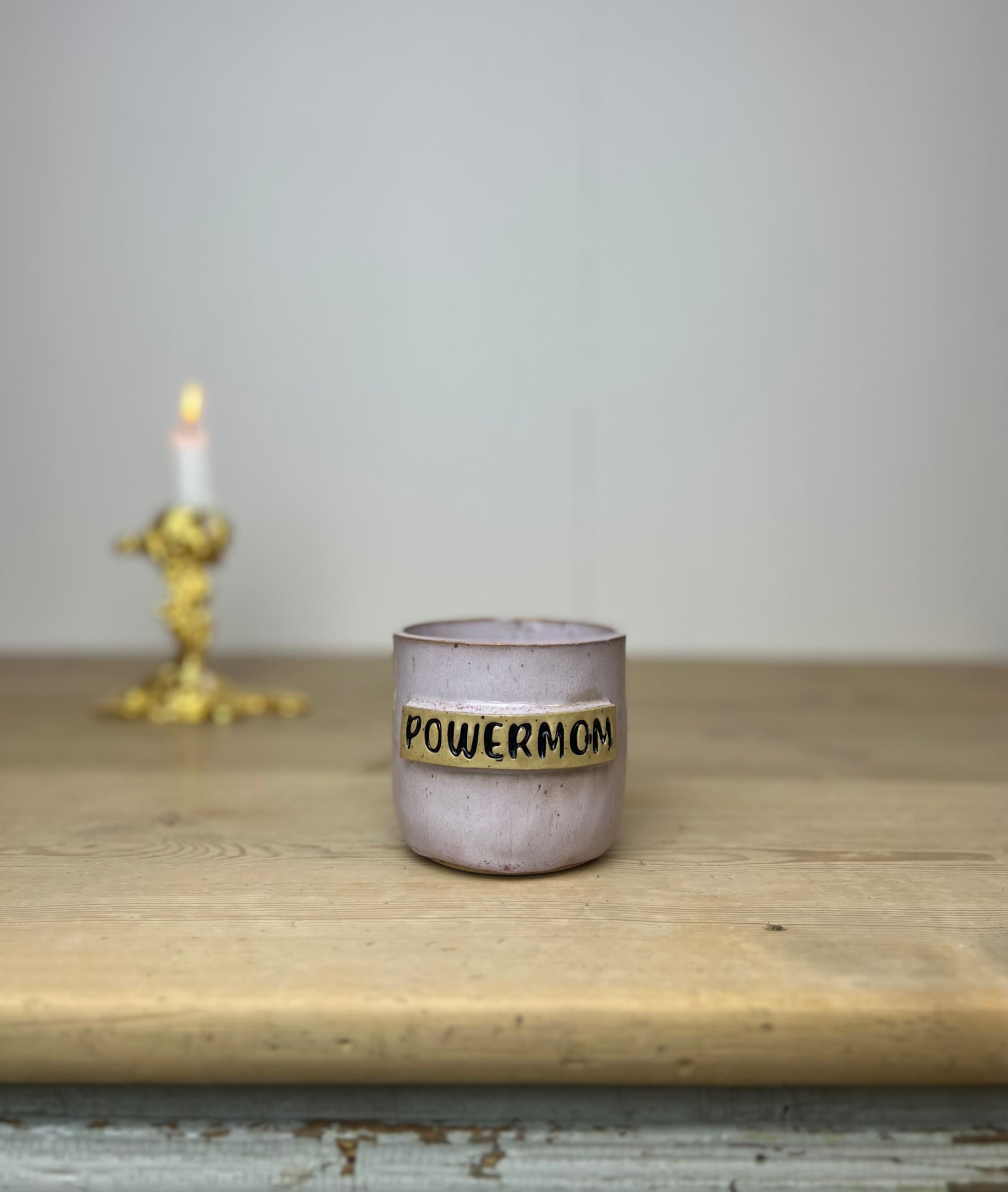 Håndlavet keramik i en blød lilla tone med budskabet, der siger det hele: PowerMom.