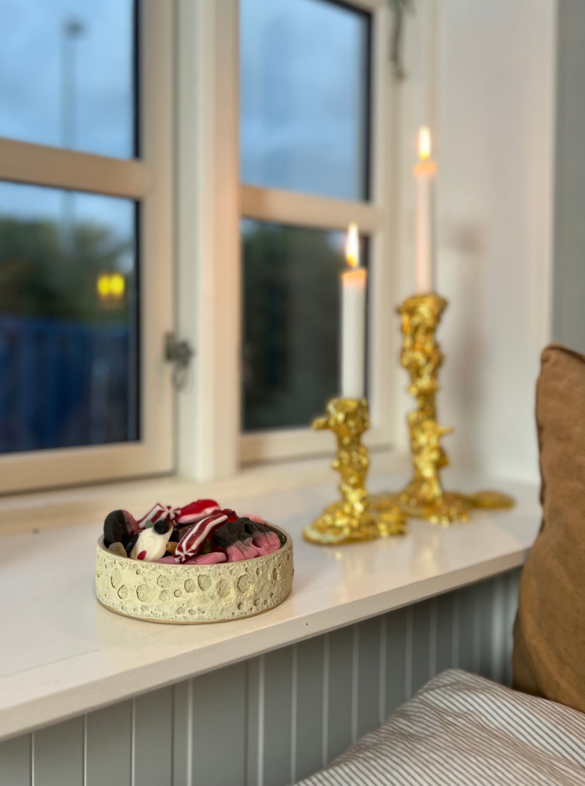 Med sin rå, kraterlignende overflade på ydersiden og sit enkle udtryk indeni, er den både dekorativ og praktisk. Perfekt til fredagsslik, lørdagsfilm eller når du bare lige skal have en god håndfuld favoritstykker for dig selv.