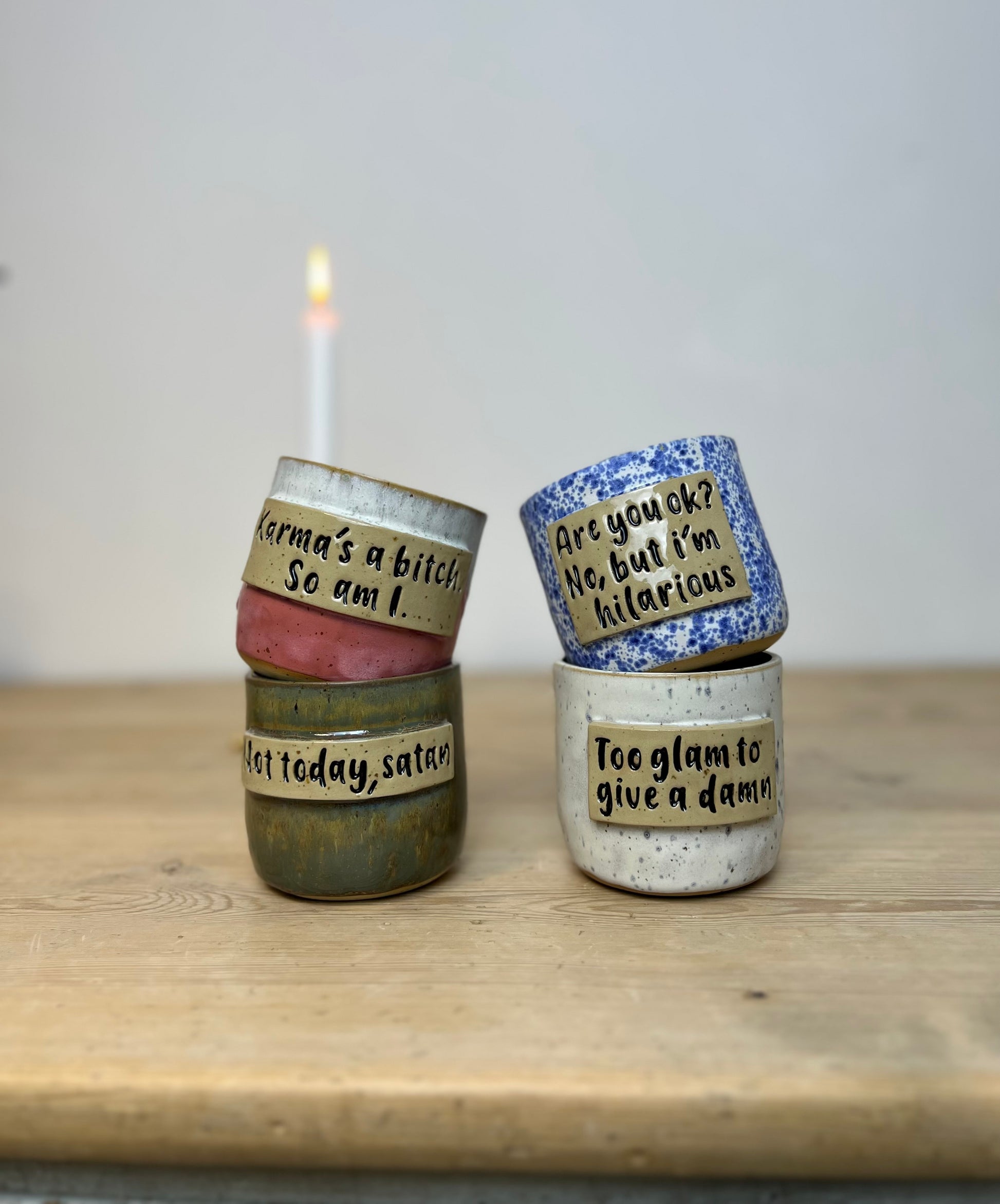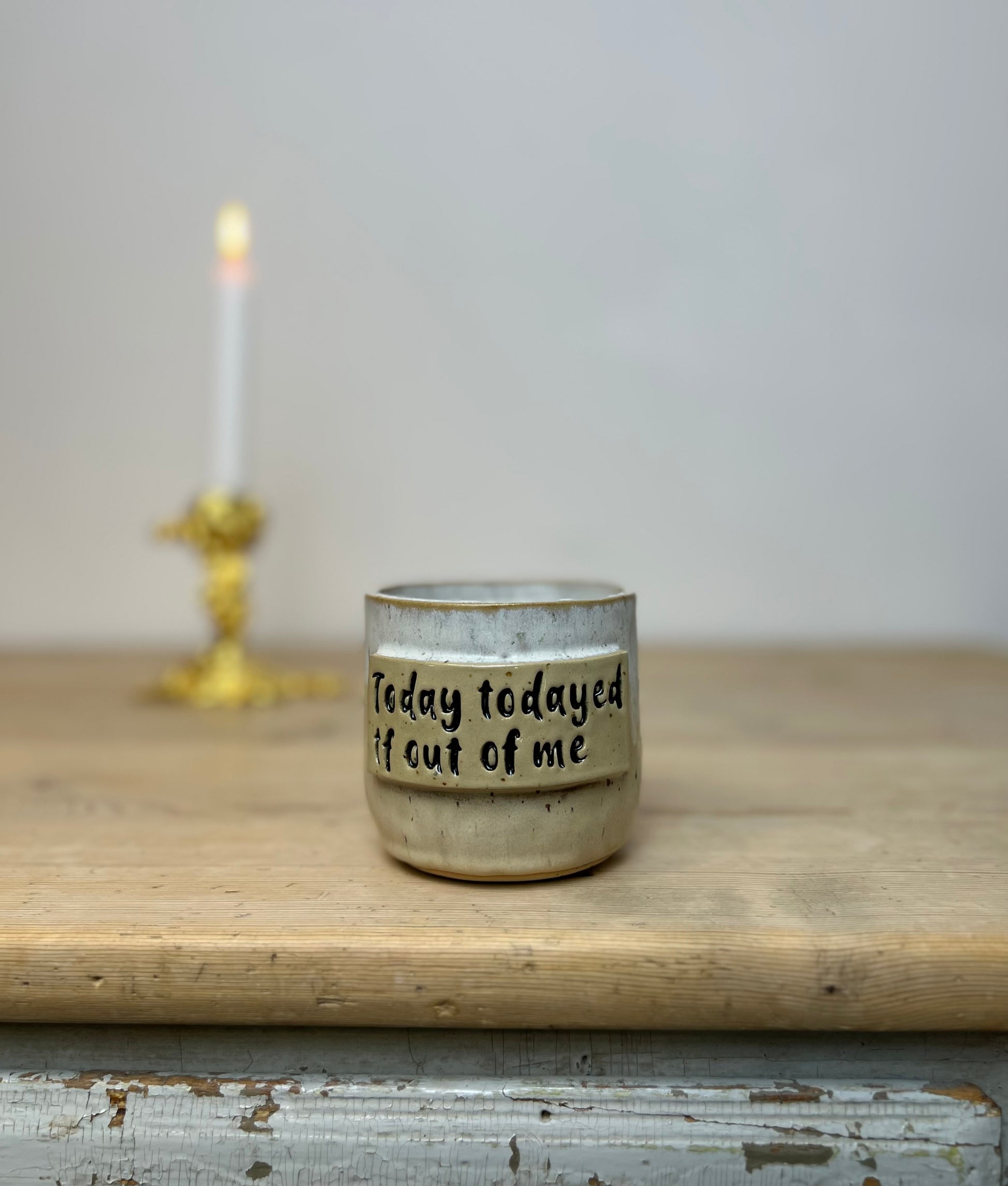 Nogle dage er bare for meget, og denne kop siger det hele for dig: "Today todayed the fuck out of me." Den er skabt til de morgener, hvor du desperat hælder kaffe i dig, mens du prøver at huske, hvad det egentlig er, du har meldt dig til. Håndlavet, ærlig og klar til at stå trofast ved din side – også når du ikke selv kan.