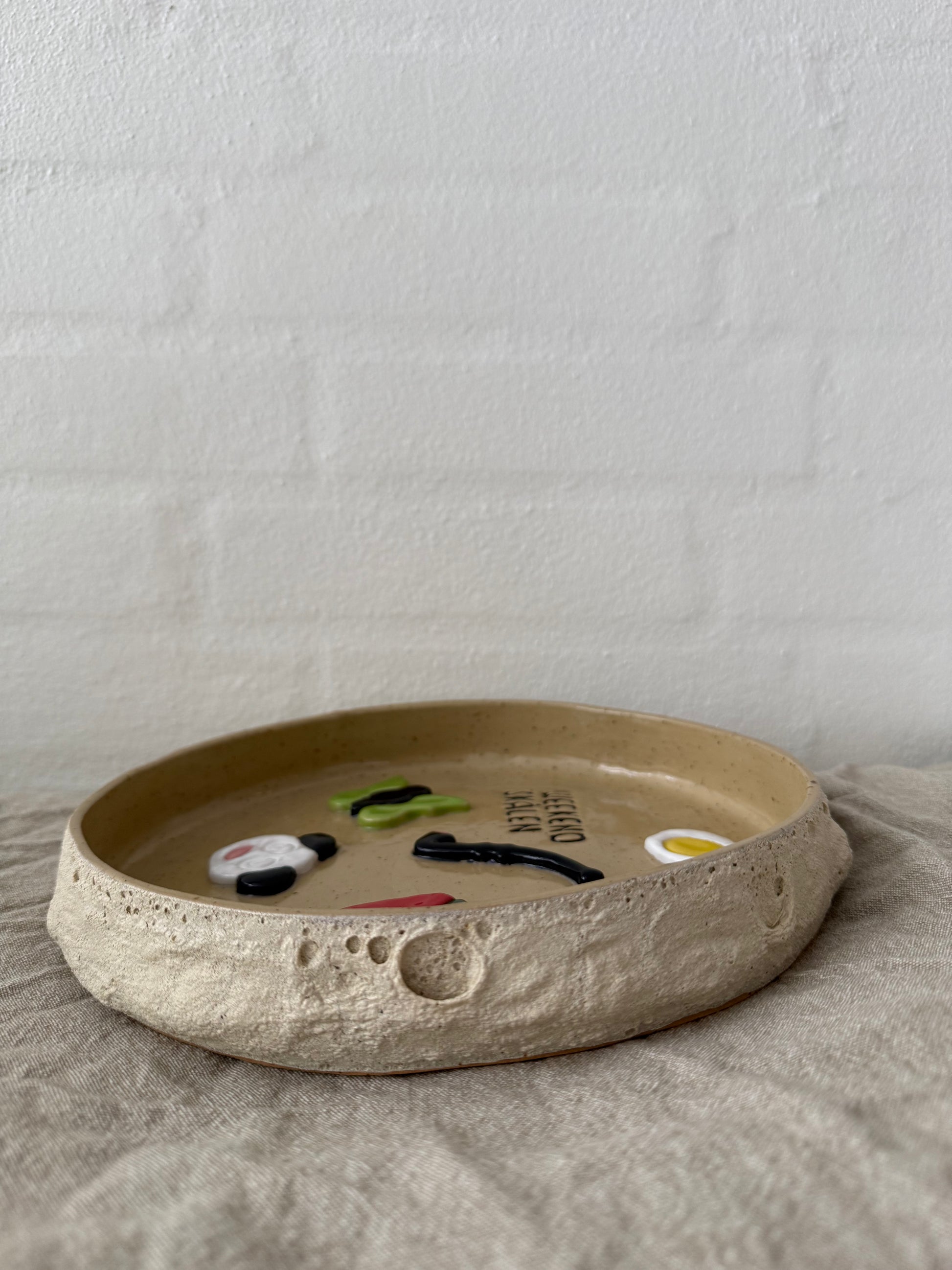 Gør weekenden lidt ekstra hyggelig med denne unikke håndlavede slikskål. Skålen er fremstillet i stentøj med en rå, organisk yderside og en glat, glaseret inderside i varm beige. Indeni er skålen dekoreret med charmerende små farverige motiver
